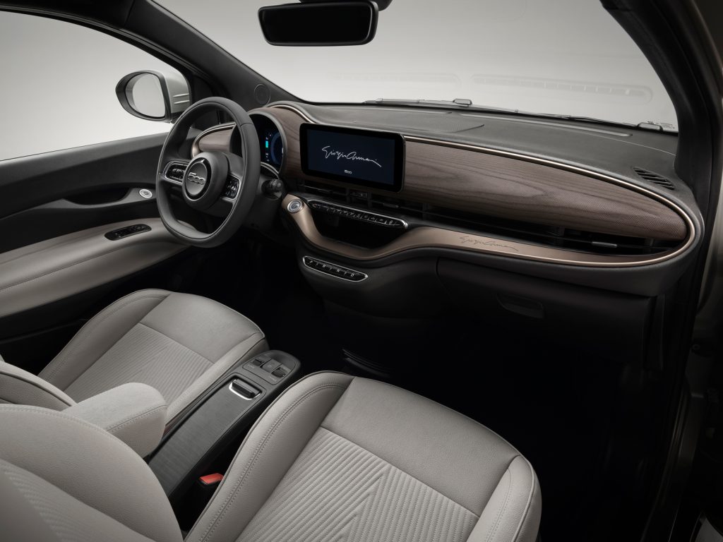 FIAT 500e Giorgio Armani Collector’s Edition’ın iç mekânı, geleneksel el sanatları tekniklerini anımsatan şerit dikişler ve orta koltuk eklerindeki üç boyutlu desenlerle yansıtılan işçiliğe dikkat çekiyor. Bu detaylar arasında gösterge panelinde lüks kumaşa benzer bir yumuşaklık sunan lazer kesim ahşap bir ek yer alıyor. Bunlara, ince işçiliğe olan bağlılığı vurgulayan ayrıntılı el işçiliği unsurları, nakışlar da eşlik ediyor. Aracın jantlarında ve koltuklarında Milanolu üstadın logosu yer alırken, imzası gösterge panelinde, iç kapılarda ve arka camda belirgin bir şekilde yer alıyor. Elbette bu da iş birliğinin özgün karakterini ve ayrıntılara gösterilen özeni vurguluyor.