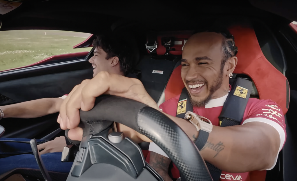 Leclerc direksiyonda ilk sırada, İngiliz takım arkadaşını selamlamak için pitlere giriyor. Charles, kendine özgü cilveli tarzıyla, “Gel yardımcı pilotum ol,” diye sırıtıyor. “Henüz zorlamadım. Seni bekliyordum.” Lewis, 1+ kabin konfigürasyonunda kemerini bağlıyor, meraklı olsa da belli ki biraz tedirgin.