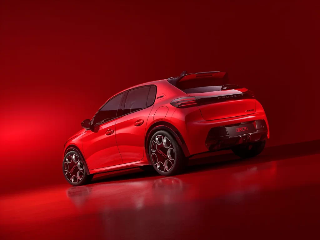 Jant kemerleri estetik ve verimlilik arasında bir başka buluşma noktası gibi görünüyor. Artan izlere uyum sağlamak için genişletilmiş ve sportif bir kırmızı çizgiyle vurgulanmış. Bu da 205 GTi’a bir başka gönderme. Alt kısımları lastikleri temizlemek için genişletilmiş ve bu da aracın sportif stilini vurgulamaya yardımcı olduğu açıklandı. Ön ve arka yüzlerin alt kısımlarında yapılan tasarım çalışmaları PEUGEOT E-208 GTi’nin sportif duruşunu daha da ustaca güçlendirmeyi amaçlamış. Ön tamponun altına bir ön spoyler eklenmiş. Arka tamponun altında bulunan ve yeni küçük bir LED sis farı entegre edilmiş özel aerodinamik difüzör, daha fazla zarafet ve gizlilik için parlak siyah renkle renklendirilmiş.
