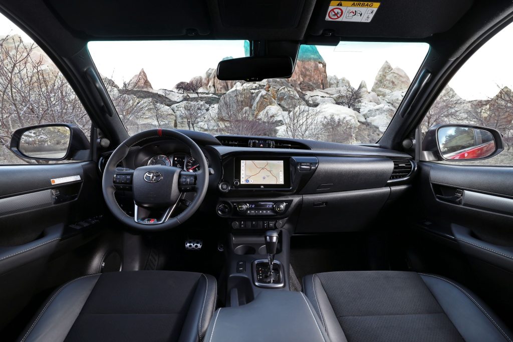 Dış tasarımıyla sportifliğe sahip Hilux GR SPORT’un bu tarzı, kabinde de devam ediyor. Siyah ağırlıklı monokrom kabin tasarımı, sportif ruhu yansıtırken, kırmızı emniyet kemerleri, direksiyon kulakçıkları ve alüminyum spor pedallar gibi detaylar dikkat çekiyor. Ayrıca Hilux GR SPORT’a özgü siyah süet ve deri döşemeli spor koltuklar, yüksek yanal kuvvetler altında da sürücü ve yolcuyu en iyi şekilde kavrayacak şekilde tasarlanmış. Motor sporlarının ayrılmaz bir parçası olan karbon fiber de, Hilux GR SPORT’un kabininde kapı panelleri ve ön konsolda dekoratif parçalar olarak yerini alıyor. Direksiyon, koltuk başlıkları, bilgi ekranı ve gösterge panelindeki GR logoları, aracın TOYOTA GAZOO Racing DNA’sını yansıtıyor. Araçta yer alan multimedya sistemi 8 inçlik dokunmatik ekranın yanı sıra ileri seviye sesli komut fonksiyonu ile kolayca yönetilebiliyor. Kullanıcılar Apple CarPlay ve Android Auto desteği sayesinde akıllı telefonlarını kablosuz olarak eşleştirebiliyorlar.