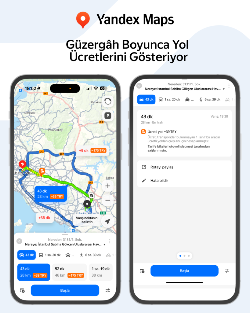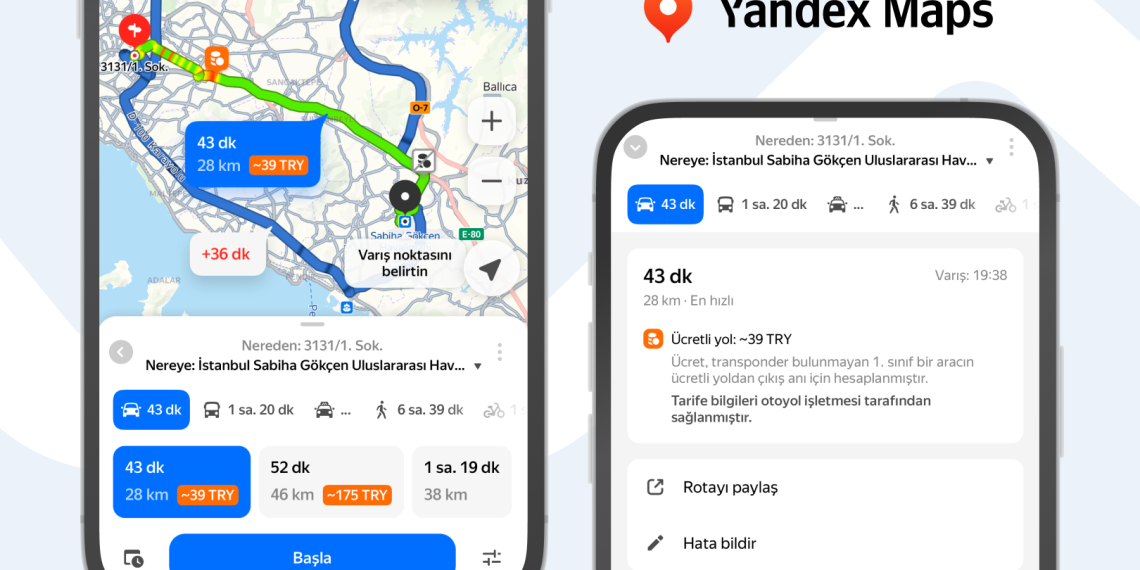 Yandex Türkiye, Yandex Maps ve Navigasyon uygulamaları ile Karayolu Trafik Haftası kapsamında, planlanan rota boyunca ücretli yolların ücretlerini tam olarak gösteren yeni özelliğiyle trafik verimliliğine olan bağlılığını bir kez daha vurguluyor. Mevcut ve yeni geliştirdiği tüm bu özelliklerle Yandex Maps ve Yandex Navigasyon Türkiye genelinde sürüş deneyimini daha güvenli, ekonomik ve konforlu hale getirmeyi hedefliyor.