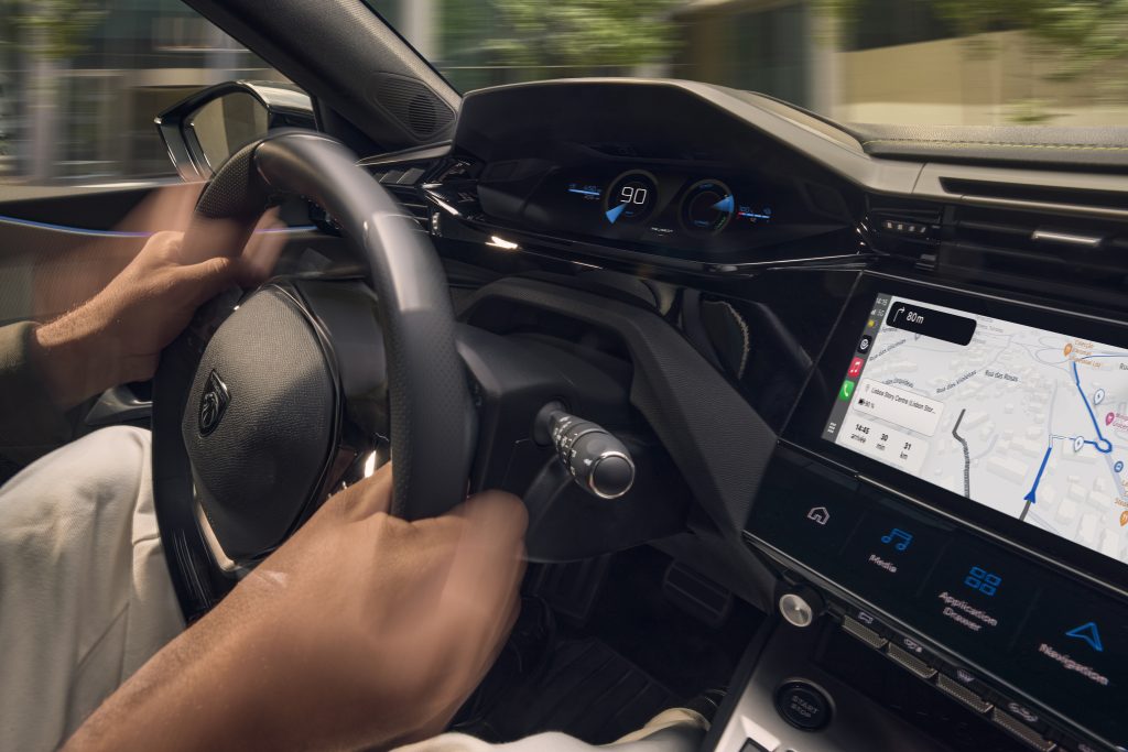 308’in kaptan köşkünde dijital gösterge paneli 10 inçlik dokunmatik ekranı ve ana kontrol tuşları bütünleşmiş görünüyor. Ön konsolun mimarisi, maksimum alan sağlayacak şekilde tasarlanmış. 308 modellerinde, şıklığı ve konumlandırılmasıyla sürüş güvenliğini artıran, 3 boyutlu grafiklere sahip dijital gösterge paneli sunuluyor (GT donanım seviyesinde opsiyonel, GT Exclusive donanım seviyesinde ise standart). Bununla birlikte dokunmatik beş adet kısayol sunan i-Toggles, şık siyah bir şerit ile bir araya geliyor ve multimedya ekranın altında ergonomik bir konumda yer alıyor. i-Toggles, yeni PEUGEOT 308 kullanıcısına klima, telefon rehberi, radyo istasyonları, navigasyon gibi belirli işlevlere kolay erişim için kişiselleştirme olanağı sağlıyor.